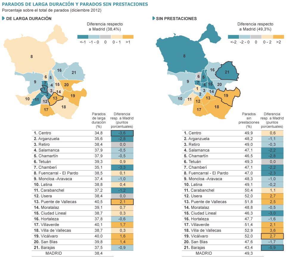 Madrid es peor ciudad que hace un año. Y no solo porque el paro ha aumentado un 10,9%, por encima de la media nacional y de otras grandes urbes. Además, se ha disparado un 21,7% la cifra de desempleados de larga duración (más de dos años); y ha incrementado un 16,6% los que no reciben prestación social alguna; y un 23,2% la de discapacitados sin trabajo. La mitad de los parados de la capital han agotado ya sus prestaciones. O lo que es lo mismo: hay 123.275 personas que subsisten sin ingresos, una cifra similar a toda la población sumada de Toledo y Segovia.