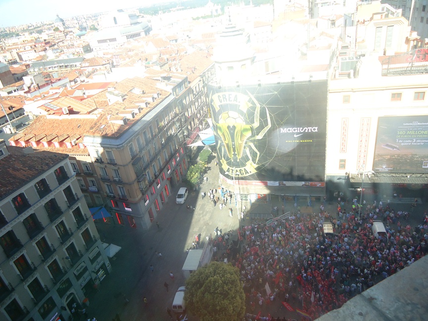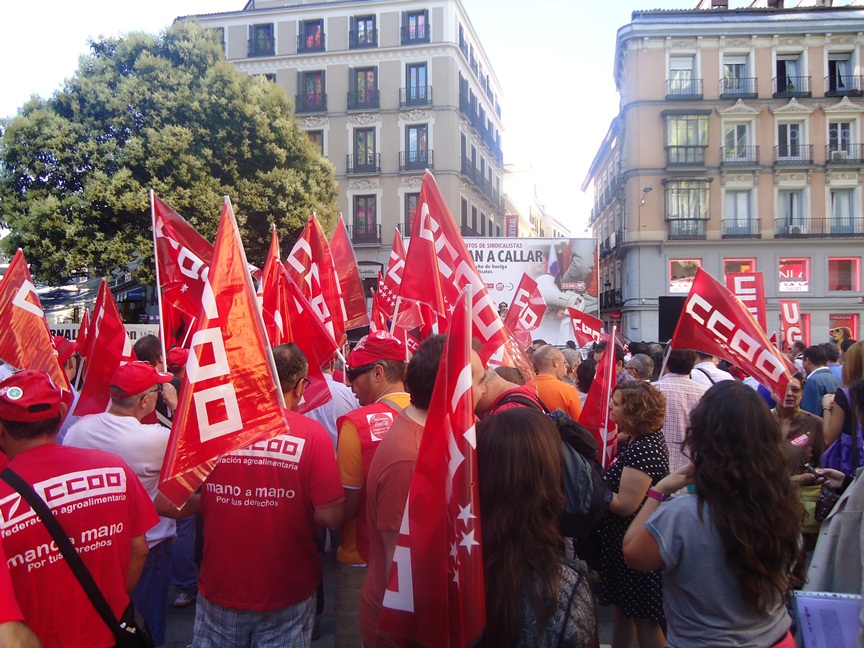 Convocados por CCOO y UGT, varios miles de personas se han concentrado esta mañana en la madrileña Plaza de Callao para denunciar «la ofensiva penal» contra los sindicatos y el derecho constitucional a la huelga y mostrar su apoyo a los más de 265 encausados, para las que el Ministerio Fiscal pide en conjunto un total de 120 años de cárcel, por su participación en huelgas.